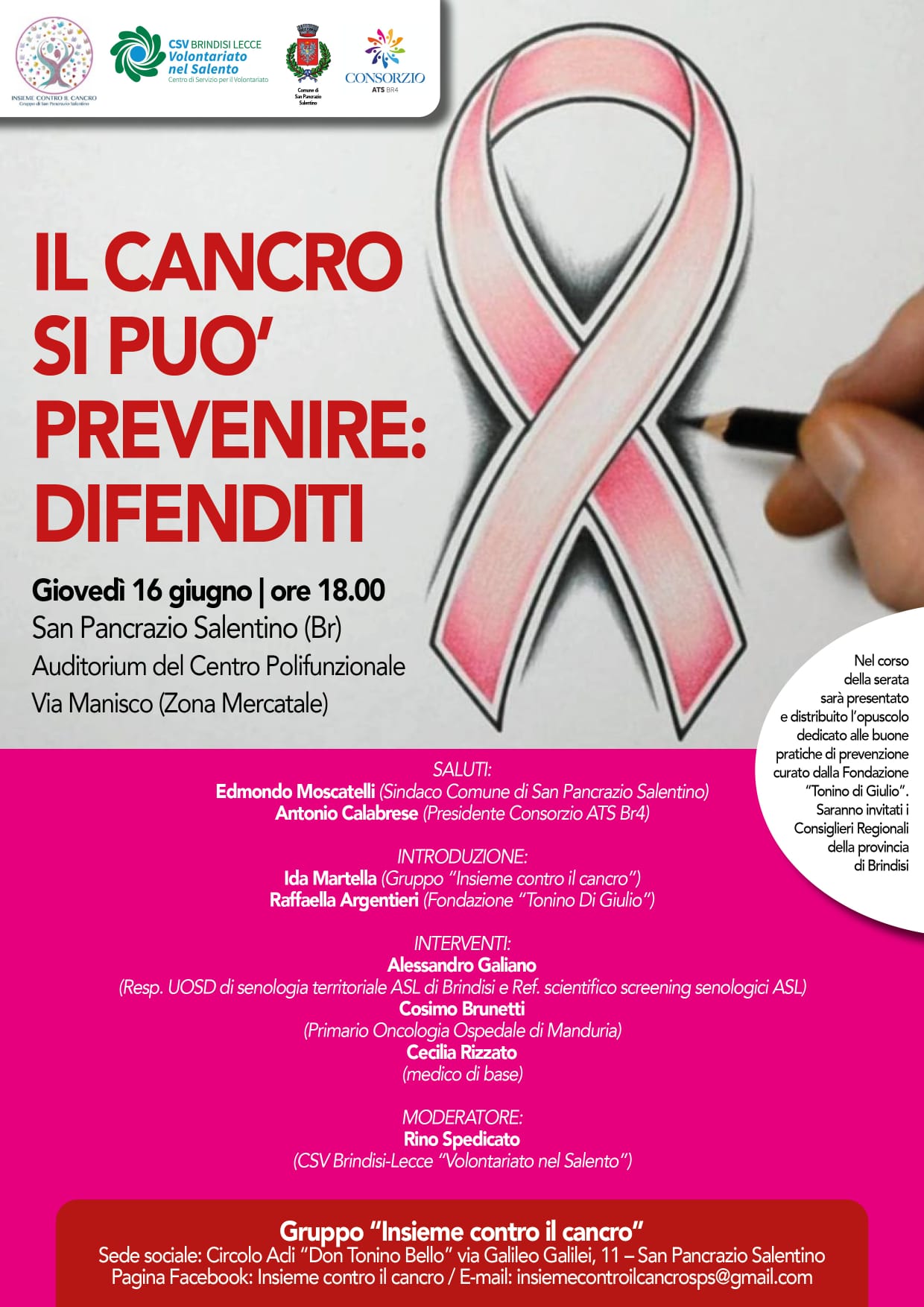 L’incontro pubblico – organizzato dal gruppo Insieme contro il cancro e dalla Fondazione Tonino Di Giulio in collaborazione con il CSV Brindisi-Lecce Volontariato nel Salento – è patrocinato dall’Ambito Territoriale Sociale BR4 e dal Comune di San Pancrazio Salentino.
